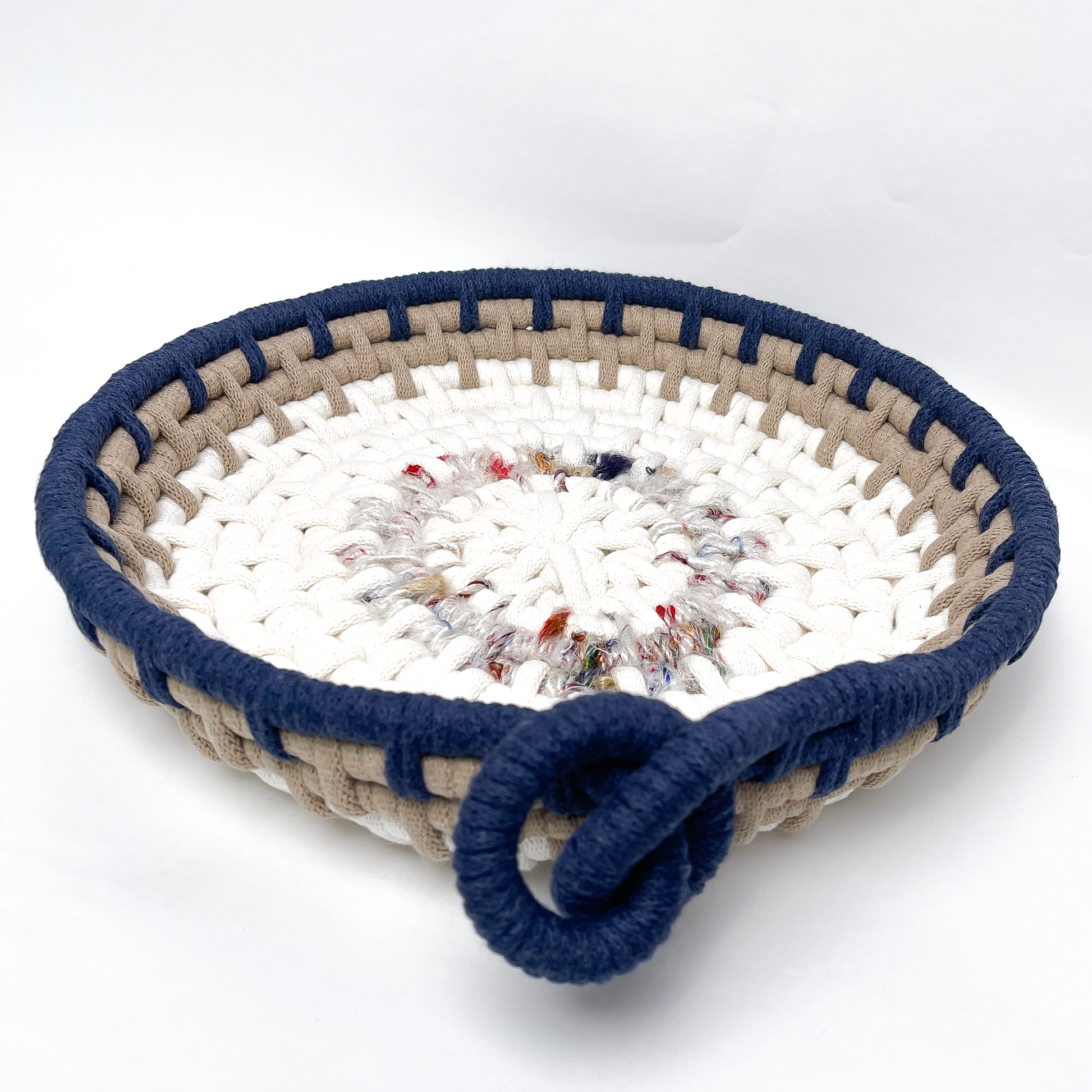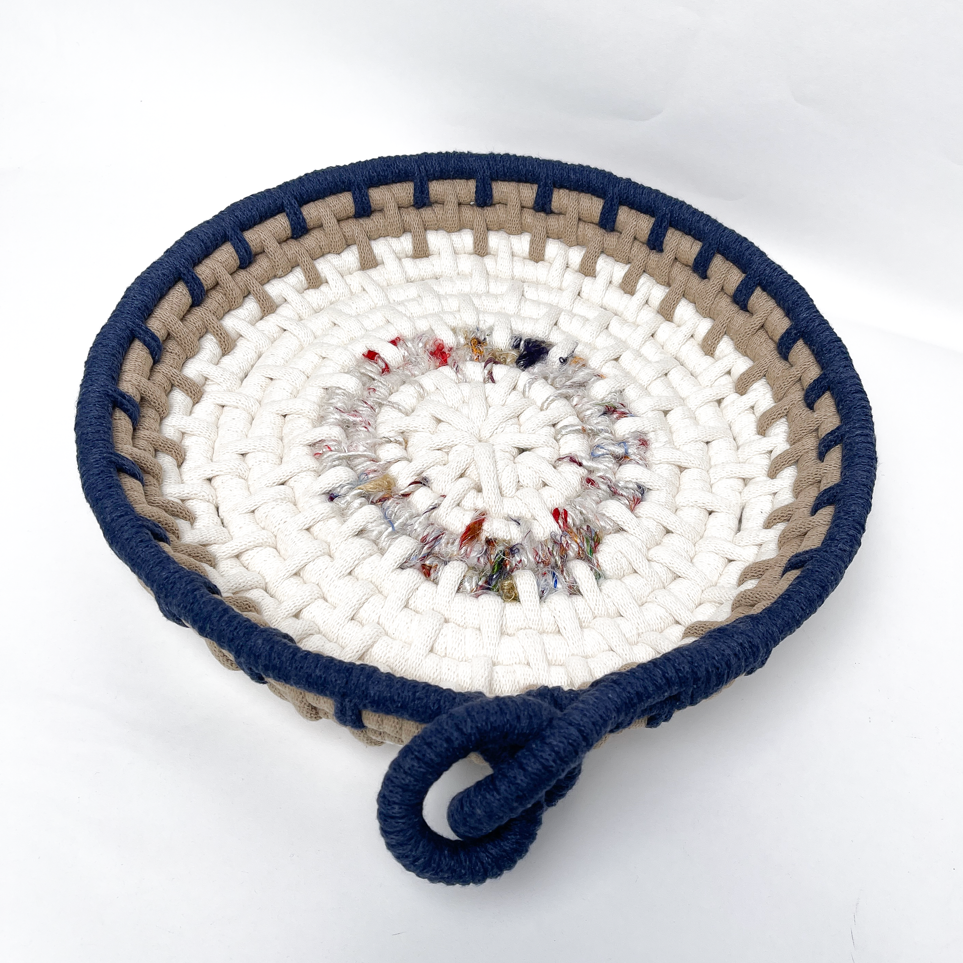 This completed hand coiled tray captures a serene coastal vibe with its deep navy base, crisp off-white coils, and a striking textured accent made from white rainbow banana yarn. Measuring approximately 12.5" in diameter and 2.5" high, it’s perfect for serving as a stylish catch-all, centerpiece, or decorative display. The shallow profile makes it both functional and visually striking. Handle with care. This is a finished handcrafted piece, not a kit. Please avoid lifting the tray by the knot to maintain its shape and durability.